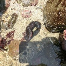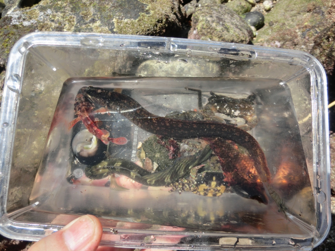 干潮を狙って網やバケツを持って行きましょう。海辺の生物がいろいろ。でこぼこ岩が歩きにくいので濡れてもいいしっかり保持できる履物を。