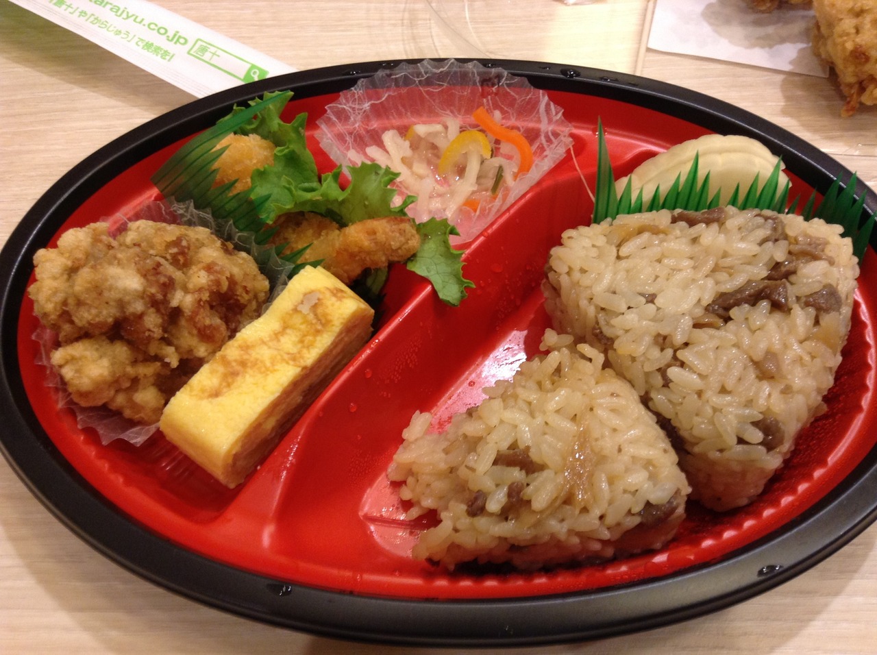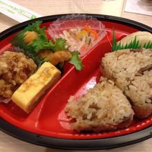 今回は、かしわおにぎりのお弁当を購入。夜7時ごろだったので、100円割引でした。