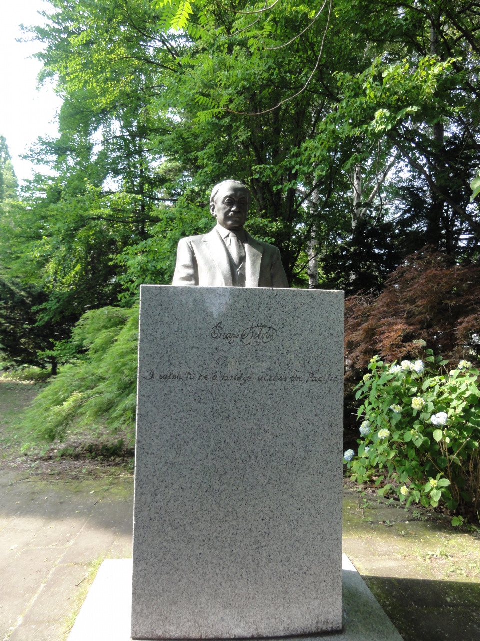 有名なポプラ並木の隣にある花木園に新渡戸稲造博士の胸像があります。北大正門から1番目は第一期卒業生の佐藤昌介像、2番目は初代教頭のクラーク像と見て、3番目が新渡戸稲造博士の像でした。札幌農学校の第2期卒業生で多方面で活躍した方のようです。ここに来なければ、新渡戸博士のことも知らないままでした。