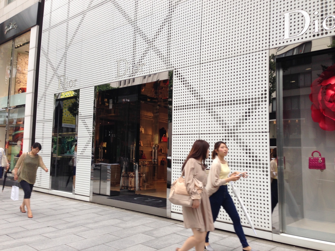 銀座の晴海通りには高級ブランドショップの出店が相次いでますが、その一角に綺麗な白い外壁で目立つディオール・銀座店があります。5階までが売場面積になっているので、かなり広くたくさんの商品を取扱っています。観光客の中国人が目立ちました。