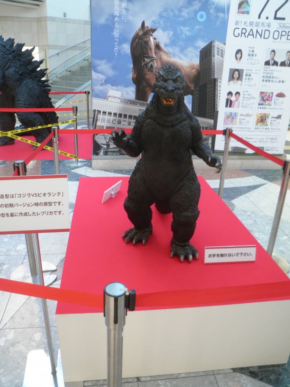 JR札幌駅から地下歩行空間チカホに行くとき、途中にあるショッピング街アピアに立ち寄りました。 ガラスのドームの下の広場のところにゴジラの人形が2体飾られていました。 どちらも精巧な作りで人間ぐらいの大きさです。映画の宣伝用なんですねぇ。