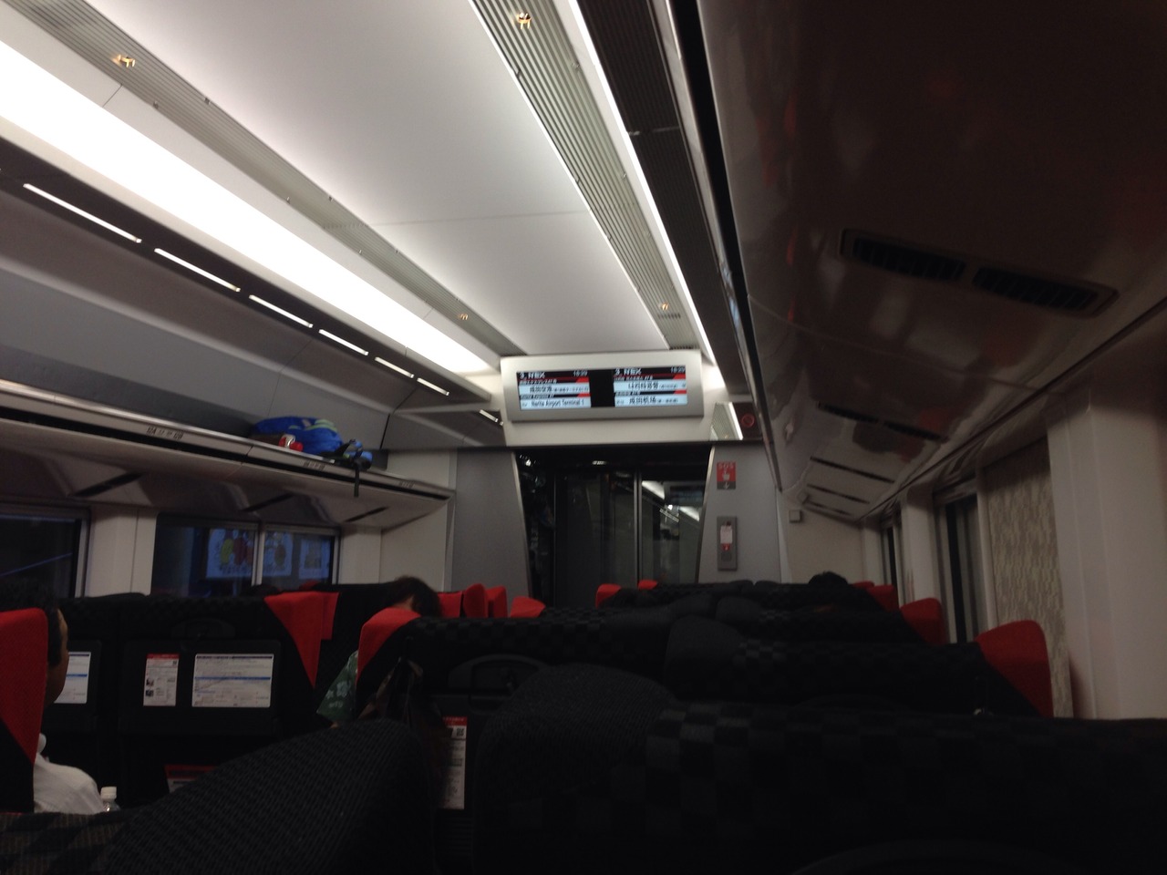 品川から乗りました。夕方の5時53分品川発。全席指定らしく、知らなくて品川の駅ねっとで並んでチケットを買いました。自動販売機でもかえるんですね。ネットでも予約出来るみたいで。四人家族ですが、2人2人に分かれた座席になりました。混んでる様なので事前予約が賢いですね。座席もゆったり、前のシートも余裕ありで狭く無いし。快適です。お姉さんが車内販売に来てくださって助かりました。子供が腹ペコでしたので。荷物置き場がありますが、ロックが付いていますので必ずロックをお勧めします。友人がトランクを盗まれました。最近は多いそうです。