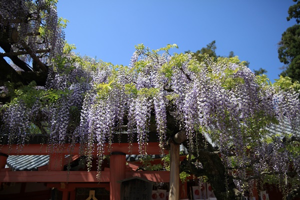 GWにゆきました、ちょうど藤の花が見ごろで、朱色に薄紫の藤の花がきれいでした。