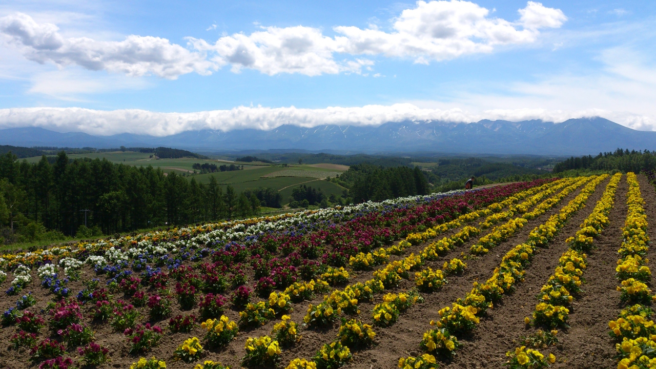 こちらの素晴らしいところは、広がる花畑の背景に見える、なだらかな丘と雄大な山々です。色彩のコンントラストとパノラマビューが、心を癒してくれます!