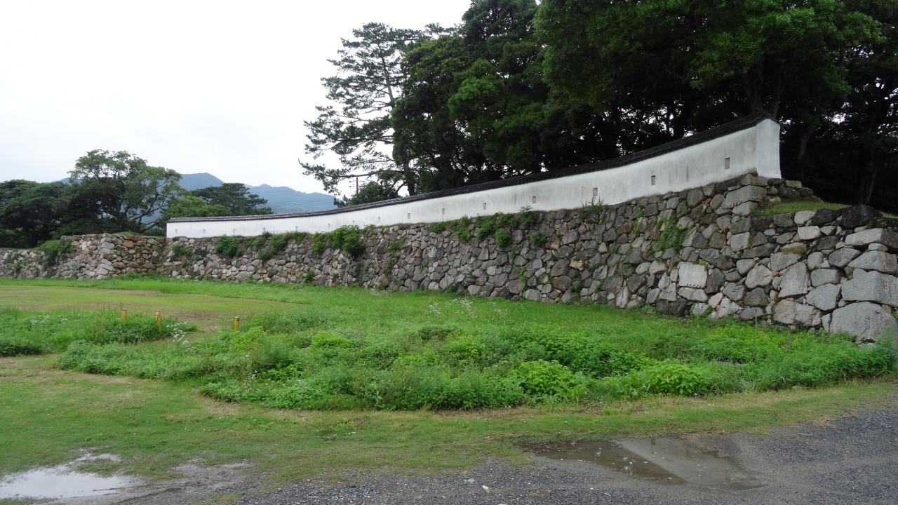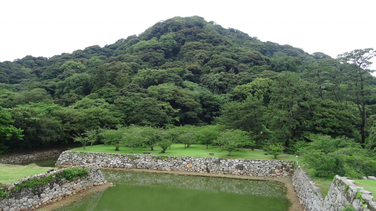 天守閣等の建物はすべて残っていませんが、石垣や堀が残っており、本丸跡が指月公園として整備されています。また、園内には梨羽家茶室や家老福原家書院、志都岐山神社等がありましたが、全般的に木がうっそうとしげっており、天気が悪い日は、やや怖いです。