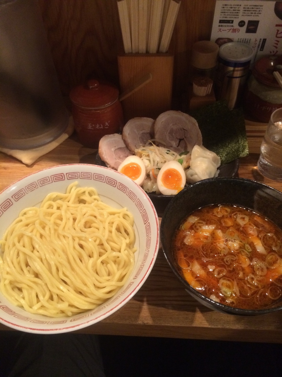 以前に行ったことがあり再訪しました。初回はつけ麺中盛をあつ盛りで、今回は辛つけ麺中盛をあつ盛りと特製トッピング(320円)で注文。魚介の味と辛味が絶妙にマッチングしていて美味。これだけでも満足ですが、トッピングがまたボリュームがあって最高でした。今度はラーメンを食べてみたいです。