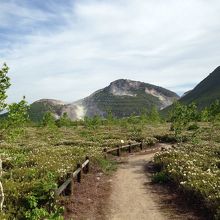 奥には硫黄山の水蒸気も見え またそれも景観の1つになっていた。