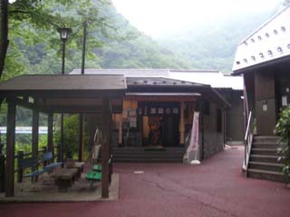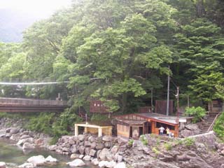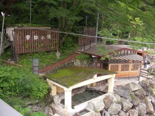 柏屋の温泉に入ったあと国道に戻って、川原に続く細い路地を進み、温泉ラーメンの店の先で階段を下ると対岸に薬師の湯の露天風呂が見えています。川の両側に遊歩道があり、周囲から丸見えなので実質男性専用です。橋を渡って対岸に出ると露天風呂の反対側に新しい薬師の湯の建物があり、こちらで料金500円を払って利用できます。