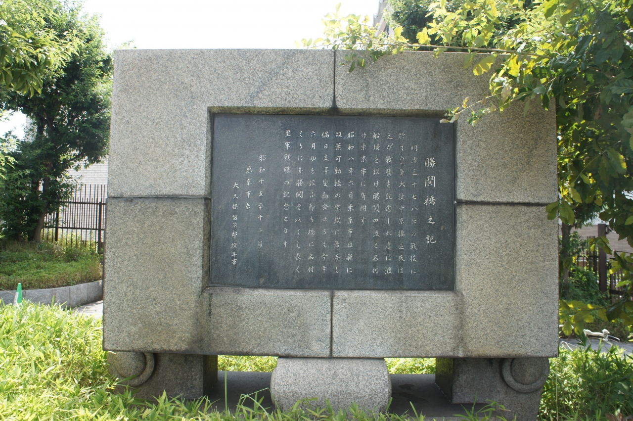 昭和八年六月東京市は新に双葉可動橋の架設に着手し偶日支事變勃發せるも今年六月功を竣ふ即ち橋に名付くるに亦勝鬨を以てし長く皇軍戦勝の記念となす