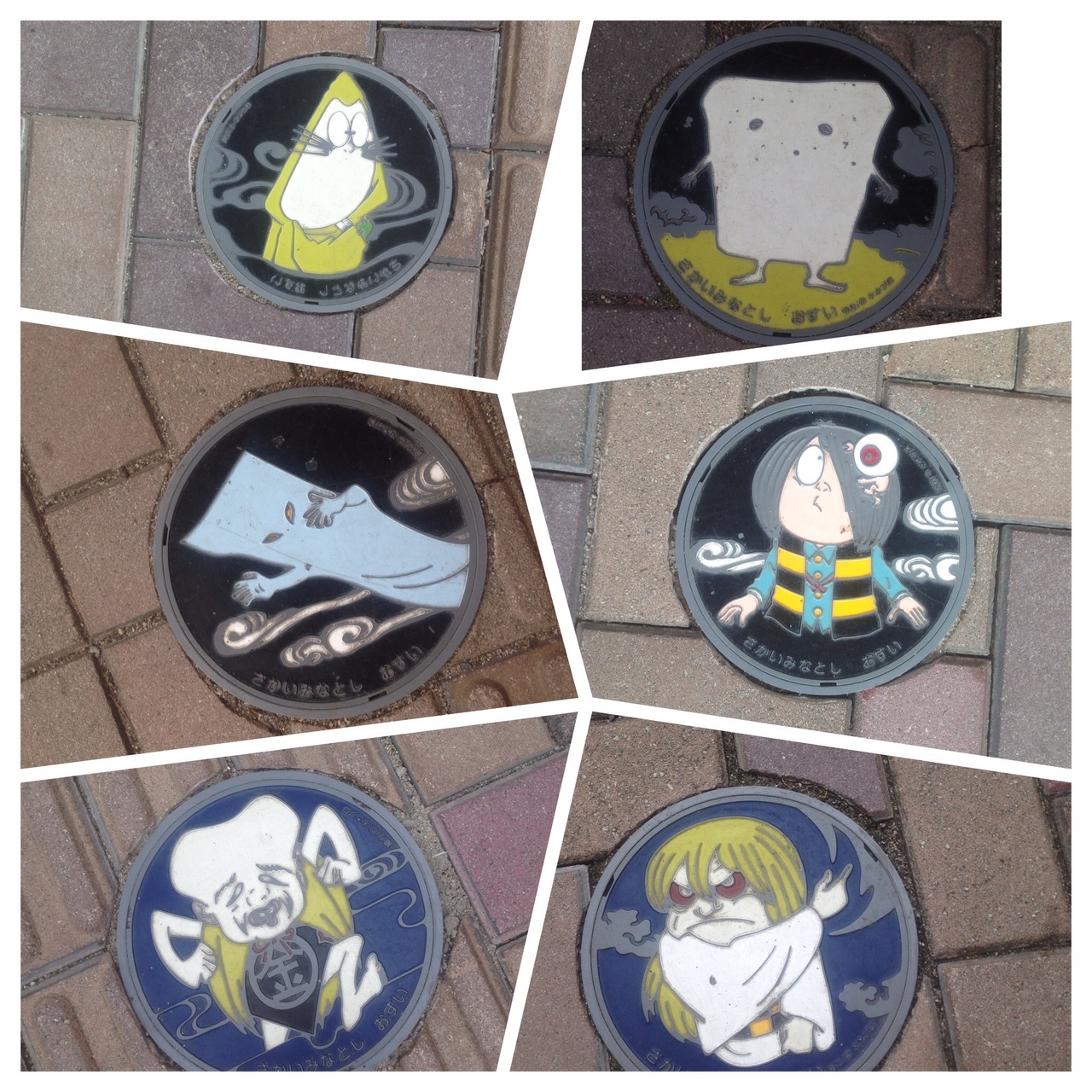 境港にある水木しげるロードは入り口から妖怪たちのブロンズ像がいっぱいあってとってもかわいいです。マンホールもおなじみキャラたちがいてとても楽しいです。たまに着ぐるみも歩いています。