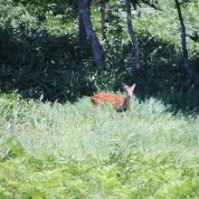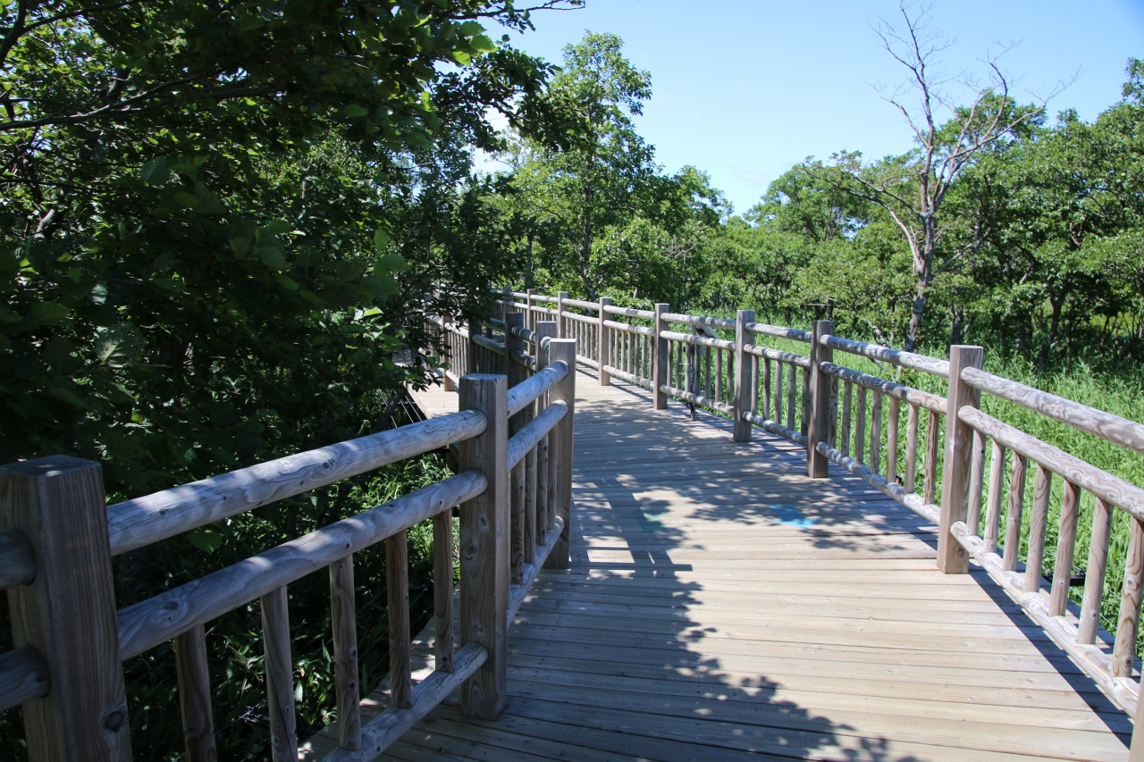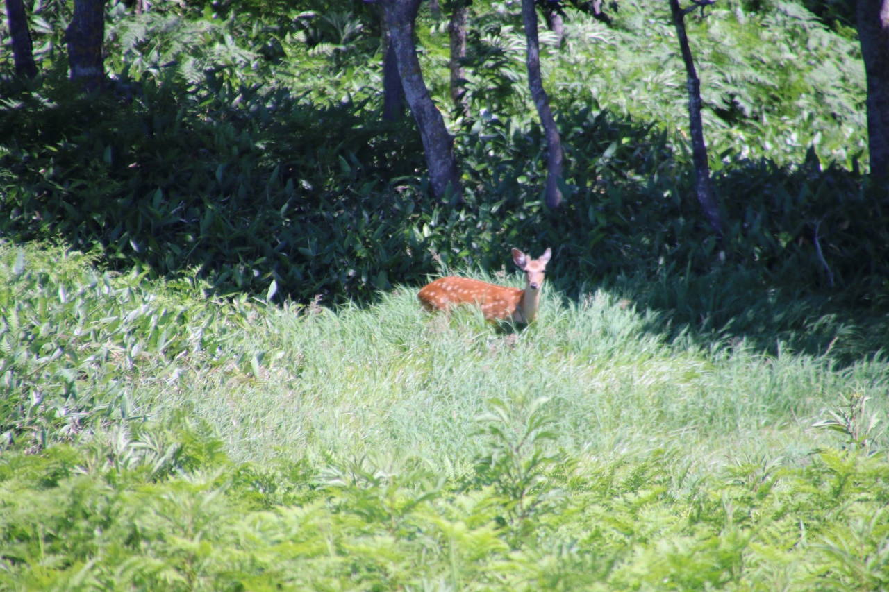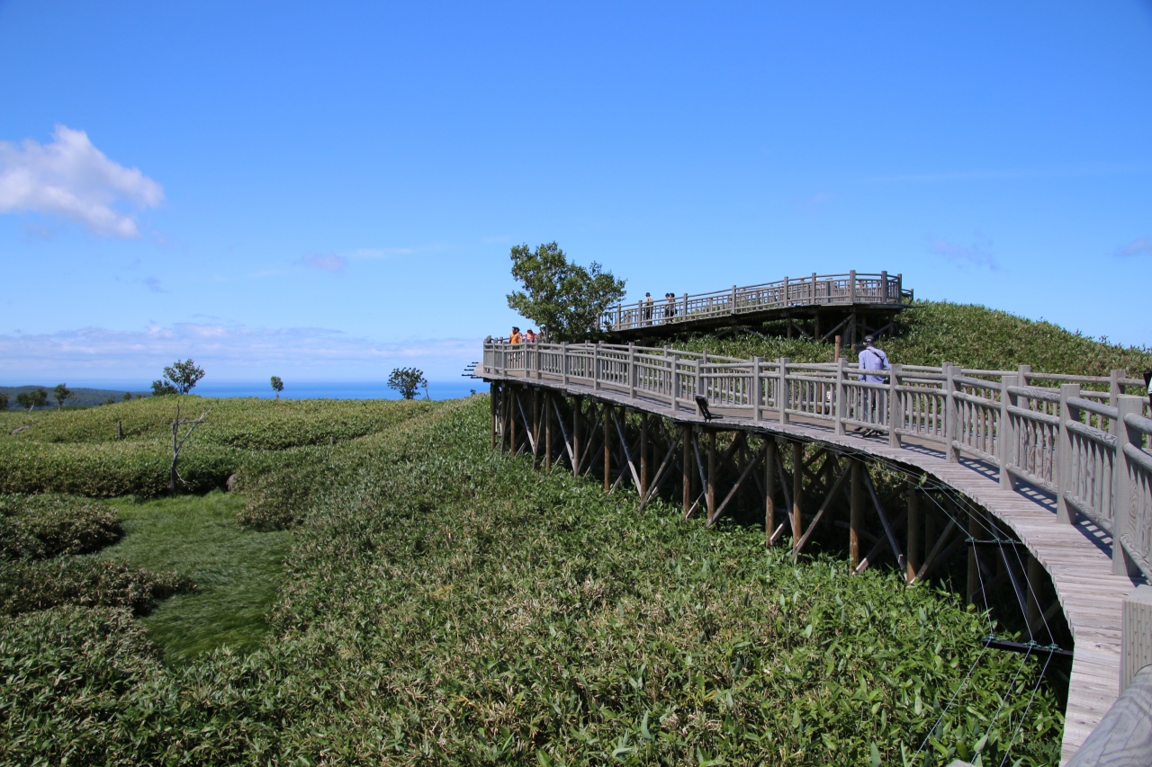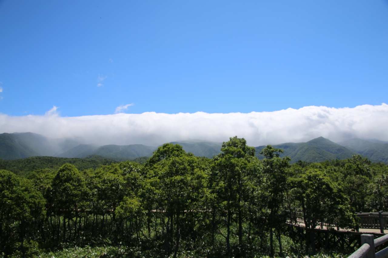 前夜にホテルで知床のレクチャーがあり、知床五湖のツアーは無理でもこの高架木道で十分堪能できるとの情報を得て、朝一番に出かけました。駐車料金はかかりましたが、木道内は無料で入れました。安全なだけにヒグマは出ないかなって思っていましたが、ネイチャーツアーが催されていたので、木道周囲に出るわけはありませんね。でも間近の知床連山やクマ笹の生い茂ったエリアを高い所から見渡せたのでとても得をした気分になりました。五湖巡りにはそれなりの装備が必要でしょうが、ここだけなら散策気分で回れます。