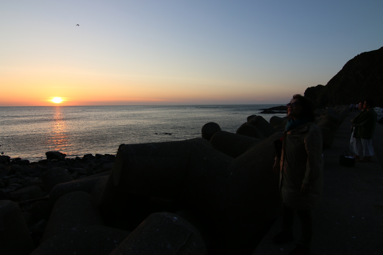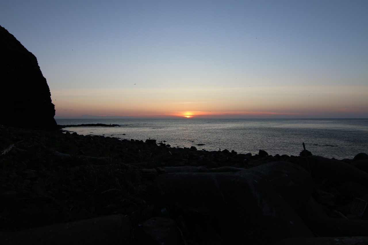 岩の頂上に展望台があり、多くの人が登っていましたが、ドライブに疲れていたので麓の防波堤へ行き、夕日を見ました。何もないオホーツク海に沈む夕日は格別でしたが、やはり夕日とマジックアワーを見るなら高台からオロンコ岩越しに夕日を見る方が良かったかなって思いました。