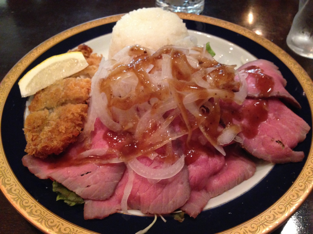 ボリュームたっぷりの冷たいローストビーフと、対照的に熱々の白身魚フライ。