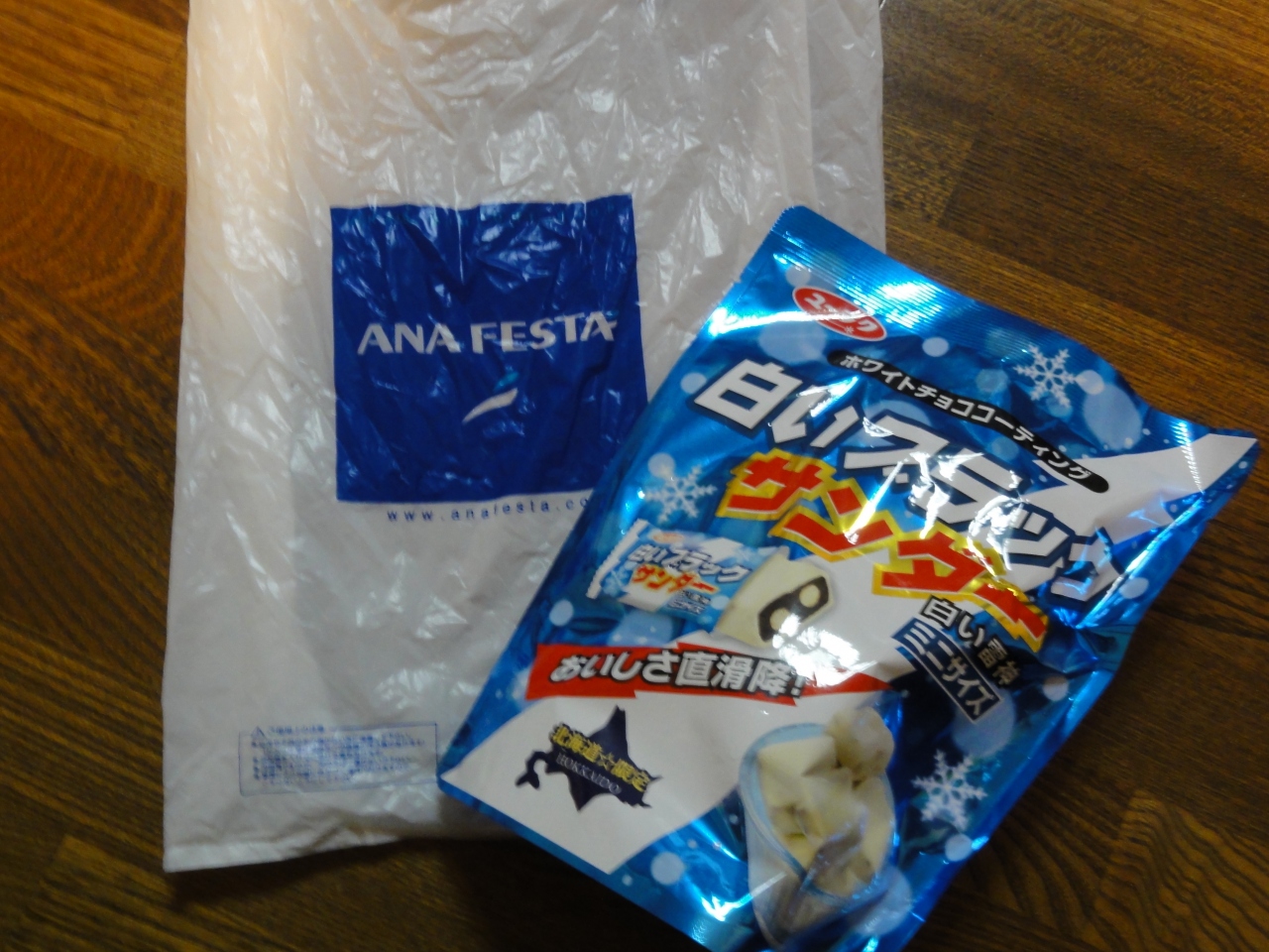 ANAカード¥1000以上で10%割引(JALは5%)はお得です。残念ながらANAカードもマイルのみの普通カードなの割引は諦めてます。出発ロビーに入ってしまえばANAに乗る時はANA FESTAが便利、常温販売してた白いブラックサンダーを購入しました。孫には人気のお菓子です。