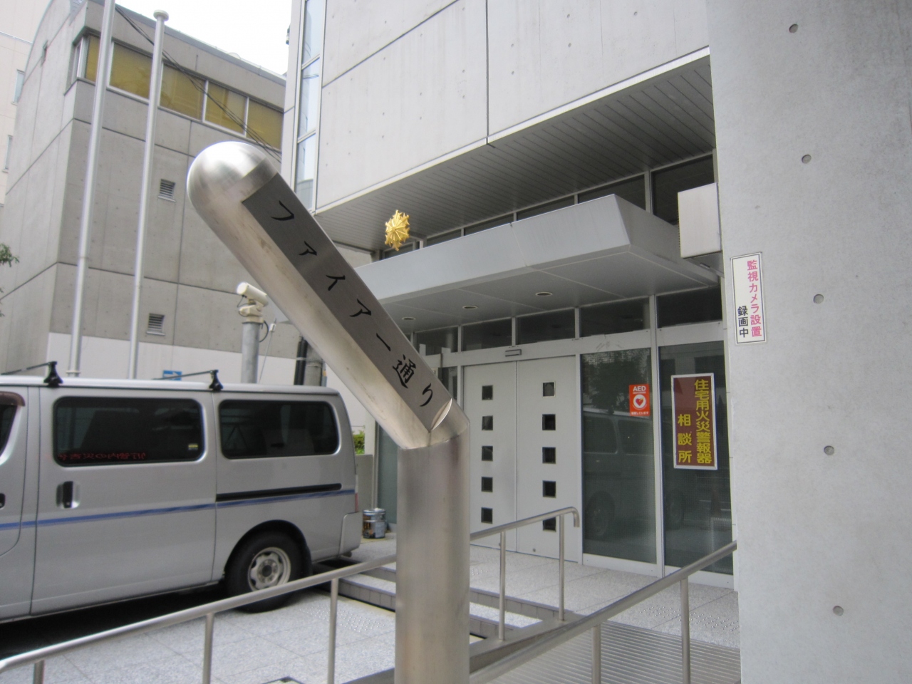 渋谷駅から丸井渋谷店前を真直ぐ、左は公園通り、電気館前(閉館)を真直ぐ(右方面に行くと山手線を潜り明治通)行くと渋谷消防署があります。そこの入口前横にファイヤー通りとステンレスの表示標がありました。立派で洒落た表示標です。岸記念体育会館に通じる道を言うそうです。消防署があるので命名、なるほど。