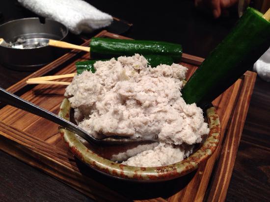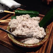 どのメニューも一捻りあって外れがないです。お通しのきゅうり+魚のすり身は美味。