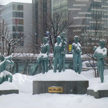 札幌市内には、モニュメントが大変くありますね。大通公園にも沢山。そして、ここ札幌駅南口には、「牧歌の像」があります。札幌駅の開駅80周年を記念して1960年の建立されています。等身大のブロンズ像は、トウモロコシやスズラン等をを持っていて、北海道を印象付ける像ですね。