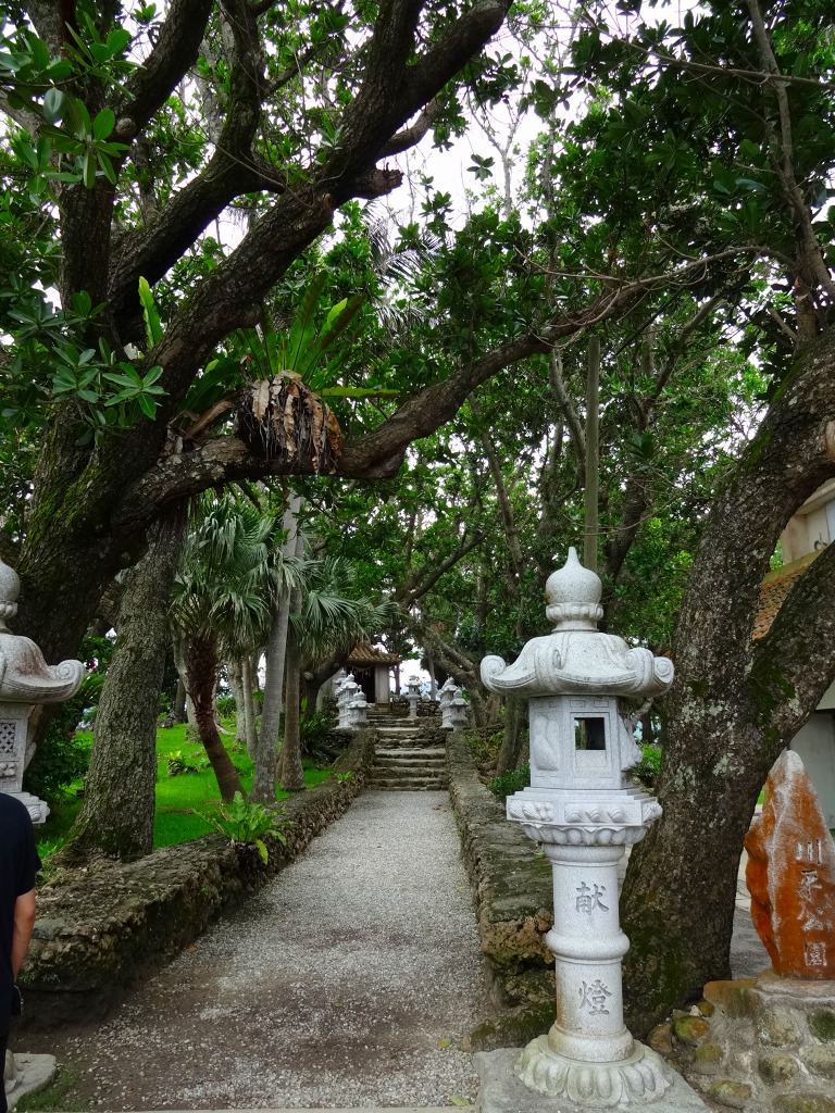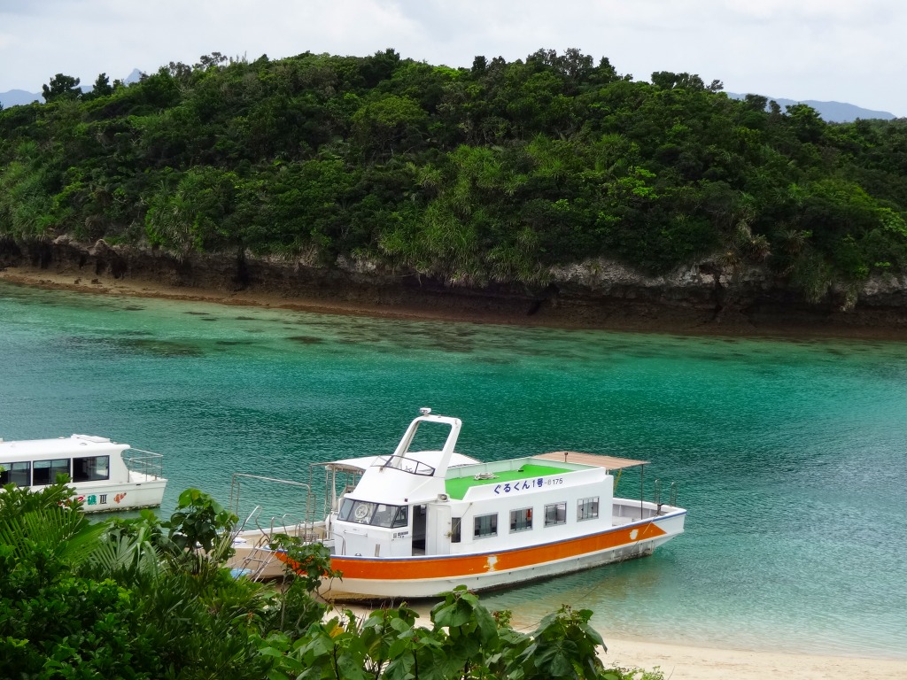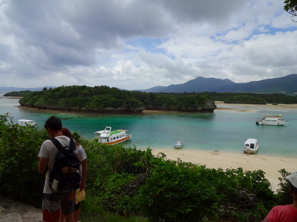 無料の駐車場から歩いて1分、小道を抜ければ美しいブルーを幾重にも重ねた川平湾が一望できます。