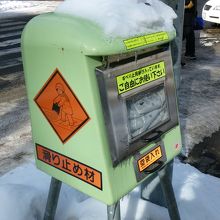 路を歩いていると、「滑り止め材」が設置されており、ご自由にお使い下さい。と表示されていました。路面が凍った時に気付いた時、即座に使用できるように設置されているんですね。大変良いことです。北海道ならではですね。