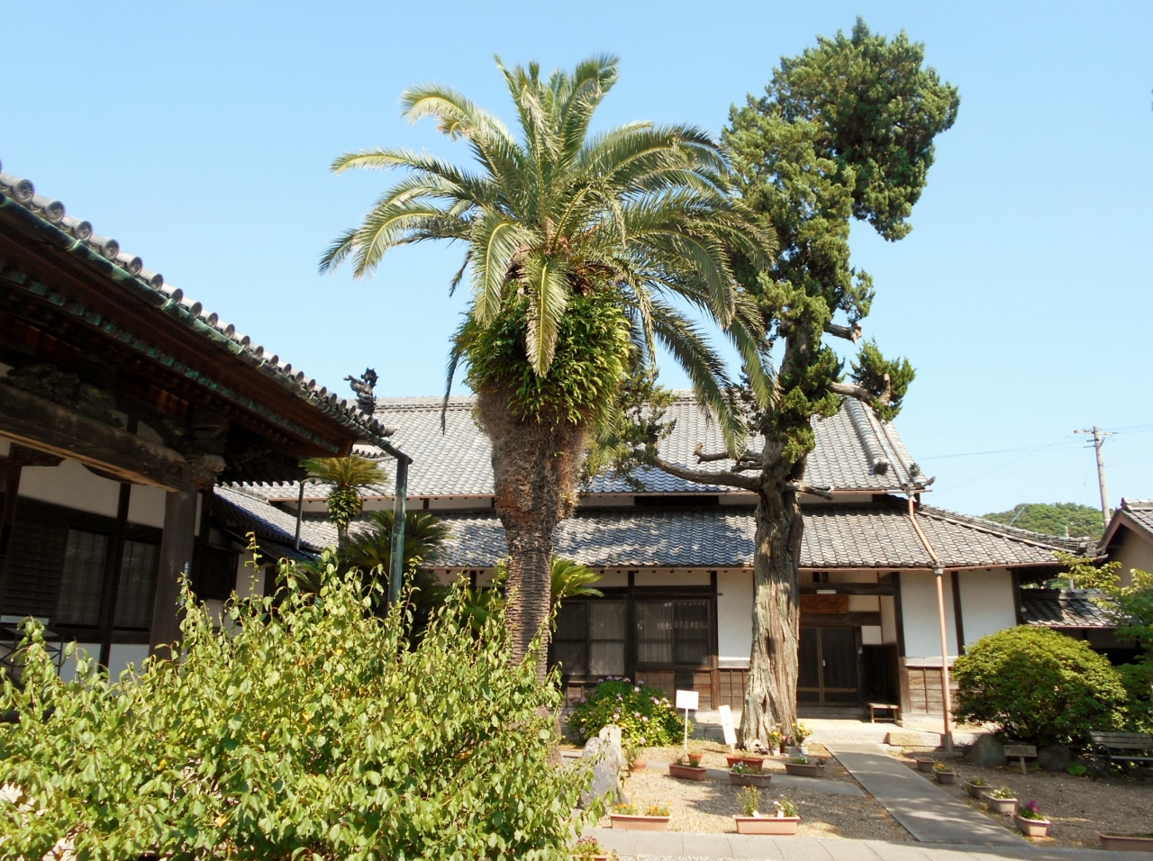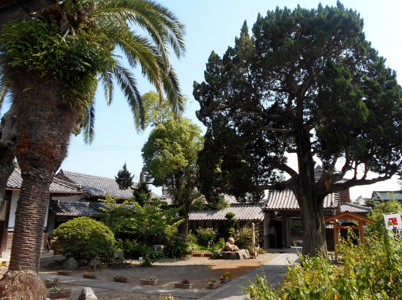 本瓦葺の本堂から観るソテツとイブキの巨木は立派ですよ。