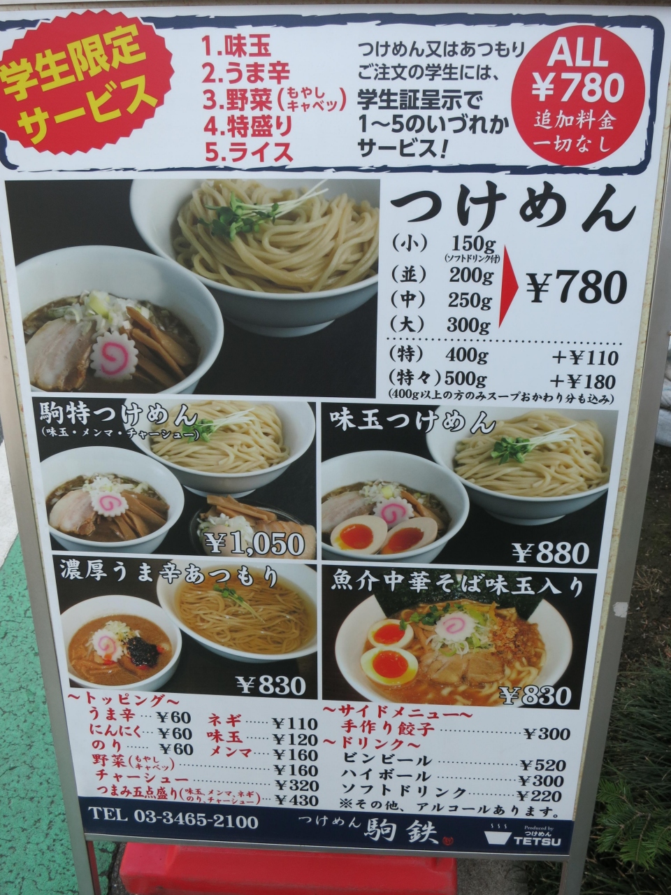 井の頭線 駒場東大前駅の東口改札を出て左手に行くと、すぐの所につけ麺 駒鉄があります。学生の多い場所がら客層も学生が多いです。学生は学生証提示すると麺増量、トッピングサービスが受けられます。つけ麺の量は300gまで同じ価格で、400g以上にするとつゆの追加を無料でしてもらえます。