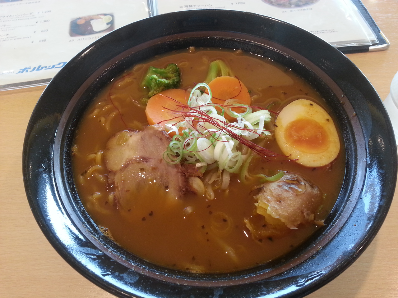 飛行機の出発まで時間があるので空港で食事をすることにしました。朝どれイカ刺身定食1500円は残念ながら売り切れ。野菜スープカレーラーメンなる新しい函館のB級グルメなのか目新しいので頼んでみることに。思ったよりスープカレーのスパイシーさも残り、結構美味しい。あとは津軽海峡がもう少しハッキリ見えればいいのに。