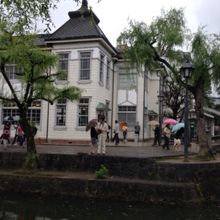 倉敷美観地区の真ん中あたりに立地しており、ちょうど倉敷川が曲がる地点の橋から写真を撮ると、いい感じなので、混んでいると、写真待ちの人が橋の上あたりで右往左往することになる。学校が経営しているので、学生の作品展示や実習も行われるなど面白い試みを実践している。