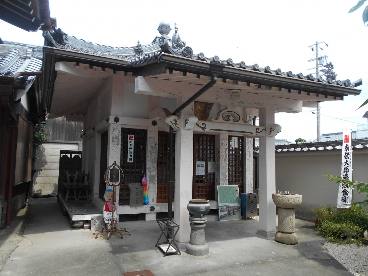 南知多町の仏閣めぐりで訪れた、知多四国八十八箇所31番札所、真言宗豊山派のお寺です。桟瓦葺の赤い山門をぬけると奥に細長い境内になっており、正面に弘法堂・左手に庫裡・本堂があります。弘法堂手前には野間大坊でみかけたマニ車がありました。