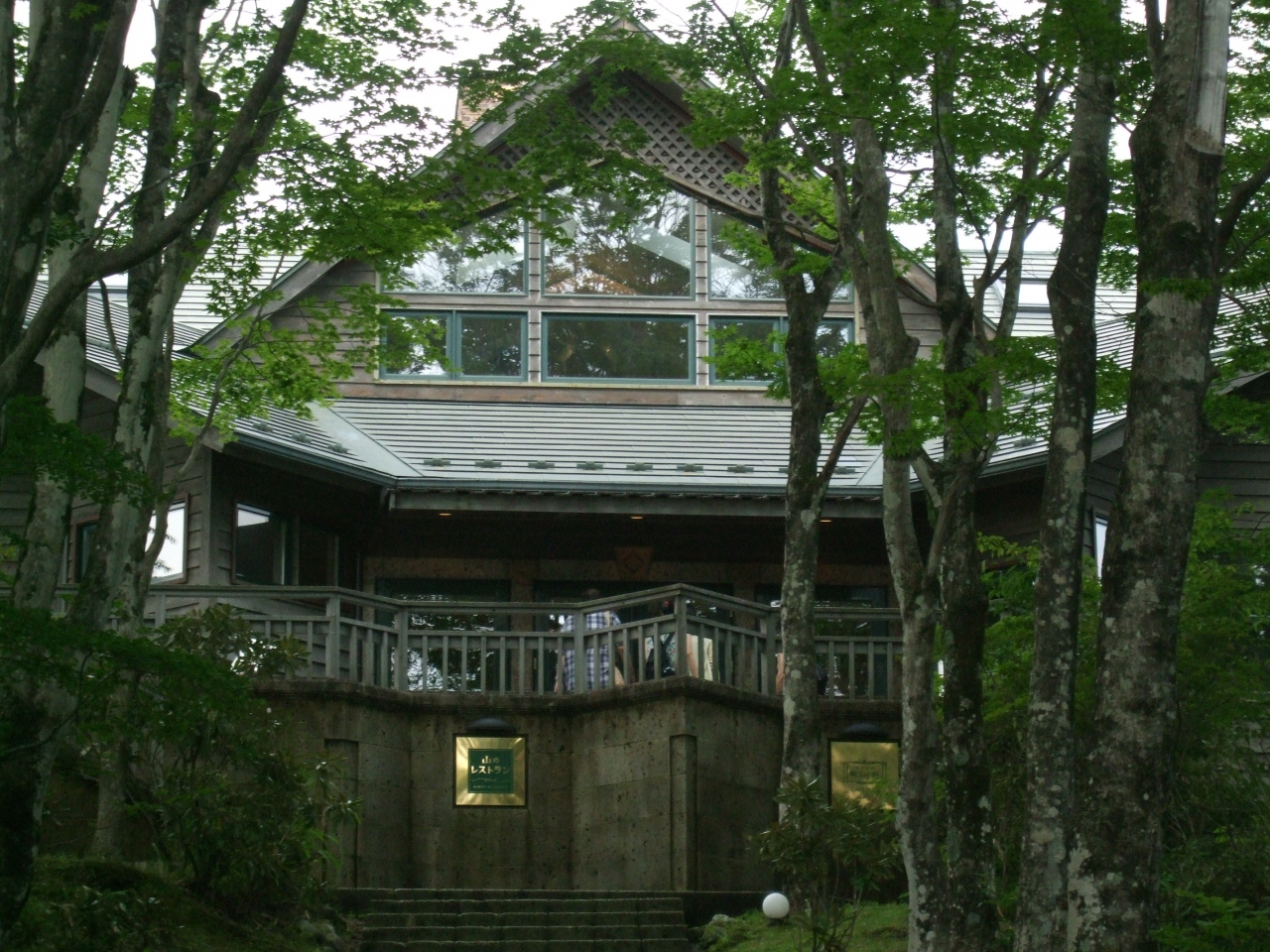 2階に一面ガラス張りの窓の前に椅子が並んでいて、霧降の滝を眺めるのに最高です。1階のテラス席ではガラスもないので、森の中の滝を独占できます。