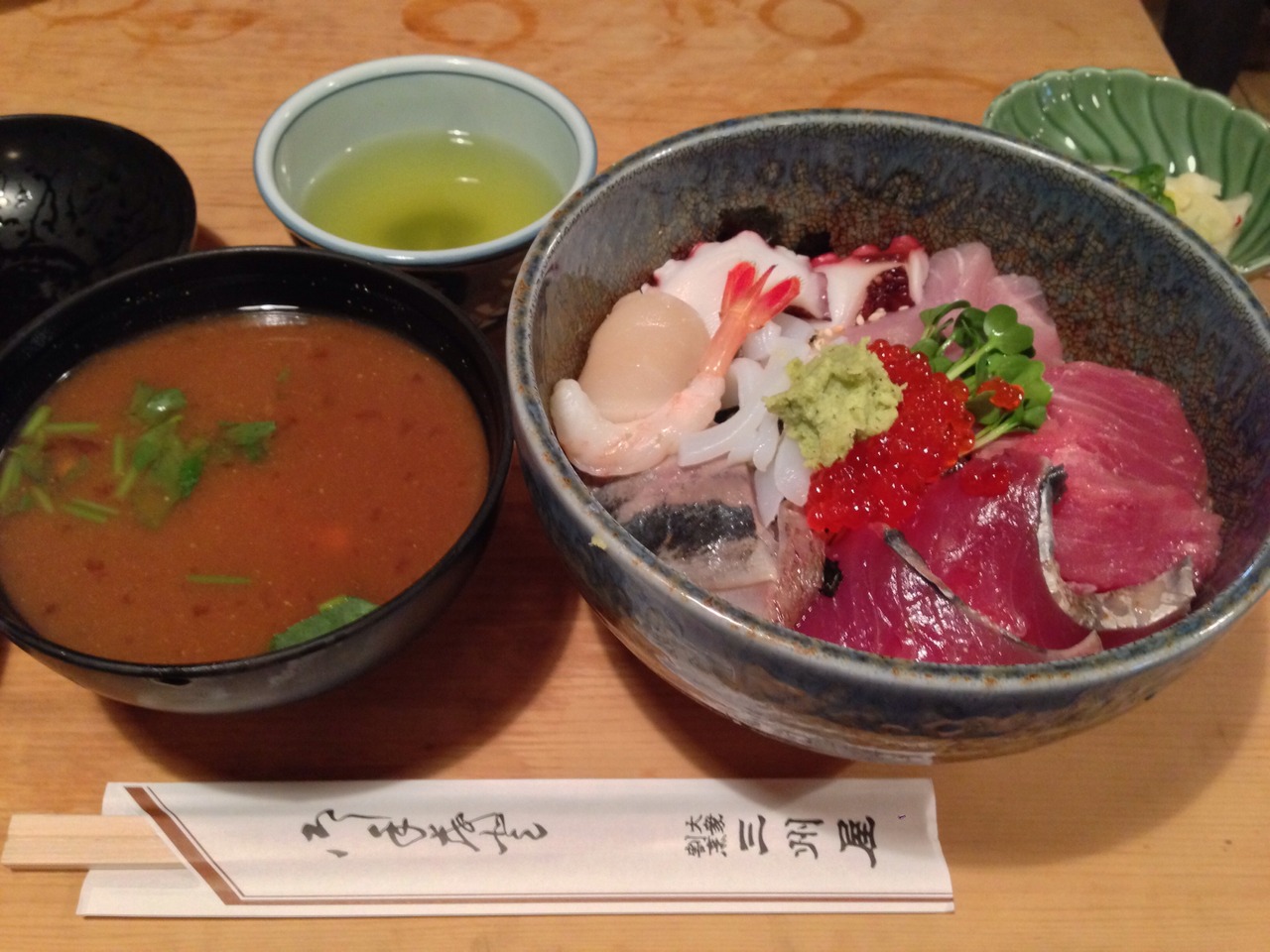 ボリュームタップリの海鮮丼とお味噌汁、お新香が付いてきます。新鮮なネタの厚いお刺身はどれもとても美味しいです。大満足のランチでした。