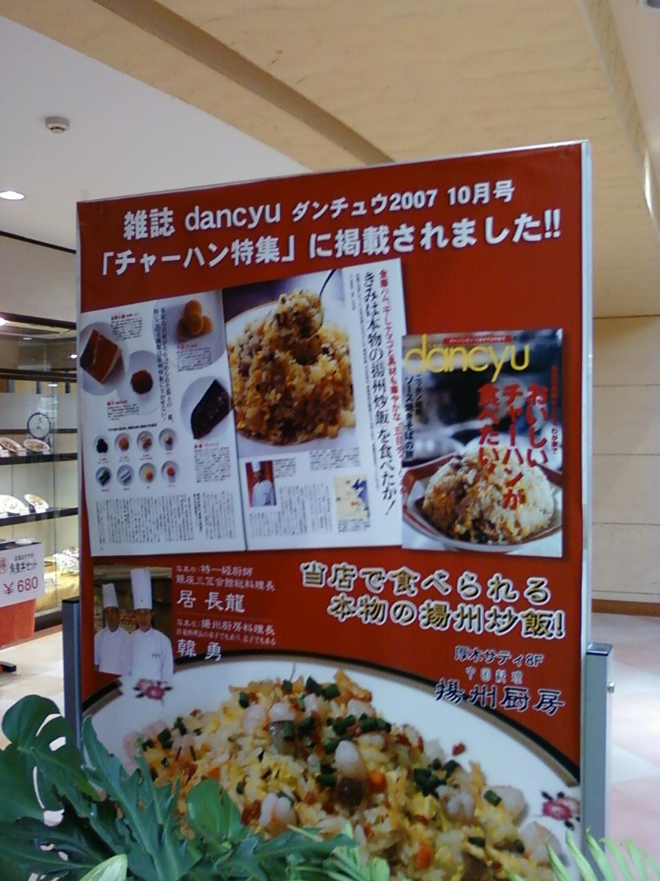 揚州厨房さんは、小田急線本厚木駅東口から三分くらいのところにある、イオン(前サティ)の八階にあります。おいしいチャーハンで有名なお店で、雑誌などでも取り上げられました。このフロアの飲食店はずいぶんと少なくなってしまい、今はもうこのお店ともう一軒しかないのですが、さすがに残ったお店だけあってかなり努力を感じます。三品で千円のテイクアウトがあるのにも驚きました。