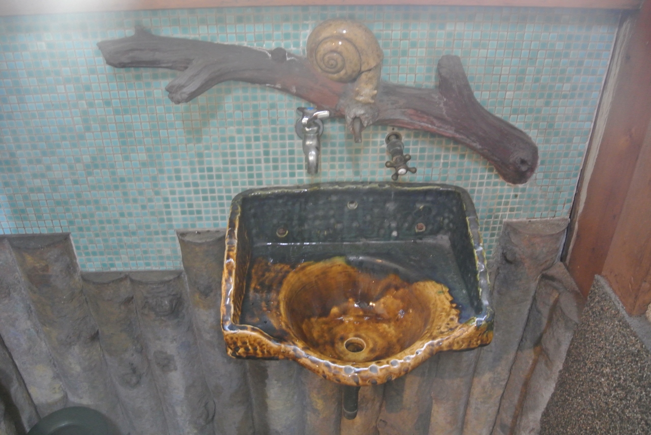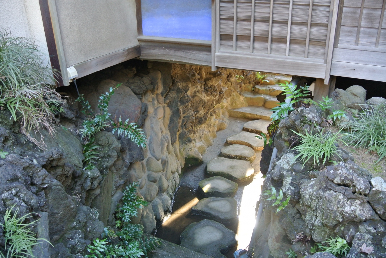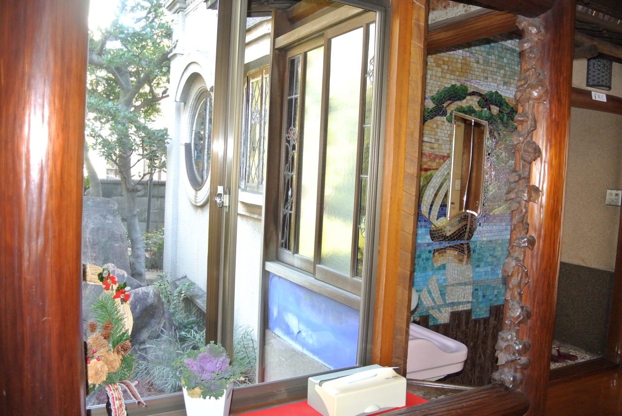 一番驚いたのは文化財でもあるお手洗いや洗面所をそのまま使っていること。普通、文化財の一般使用のトイレは別に作るものだが、ここはオリジナルのものを使用。洗面所の焼き物のかたつむりとか大丈夫だろうかと、こちらのほうがいらぬ心配をしてしまった。しかも、この建物、この洗面所やお手洗いの水回りが一番力が入っていてデコラティヴなのである。ステンドグラスも見事である。建物の下をくぐりぬけて庭に出られるようになっている造りもおもしろい。ちなみに、この近所には洋館がいくつかあって、表札が同じ名前だったので、この地域の名士のお宅なのだろう。旧街道沿いには古い商家も残っており、往時の繁栄ぶりがしのばれる。