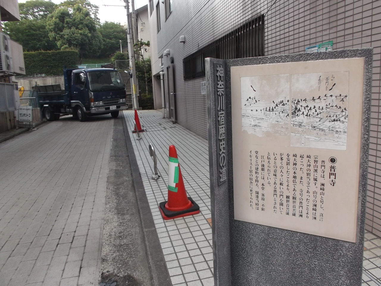 横浜市青木町の宮前商店街通りにある普門寺。道路からの入口際にかってイギリス士官宿舎であったとする寺の案内プレートが建っています。