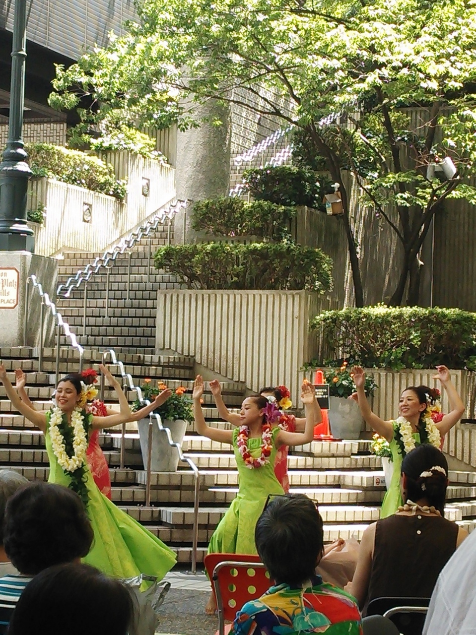 土曜日の朝、ヒルズマルシェに行ってみたら、ハワイアンの曲がかかり何かイベントの用意をしていました。何時から開始するのか全く案内看板等がなかったので、頃合いをみて行ってみたら、フラのショーが始まってました。