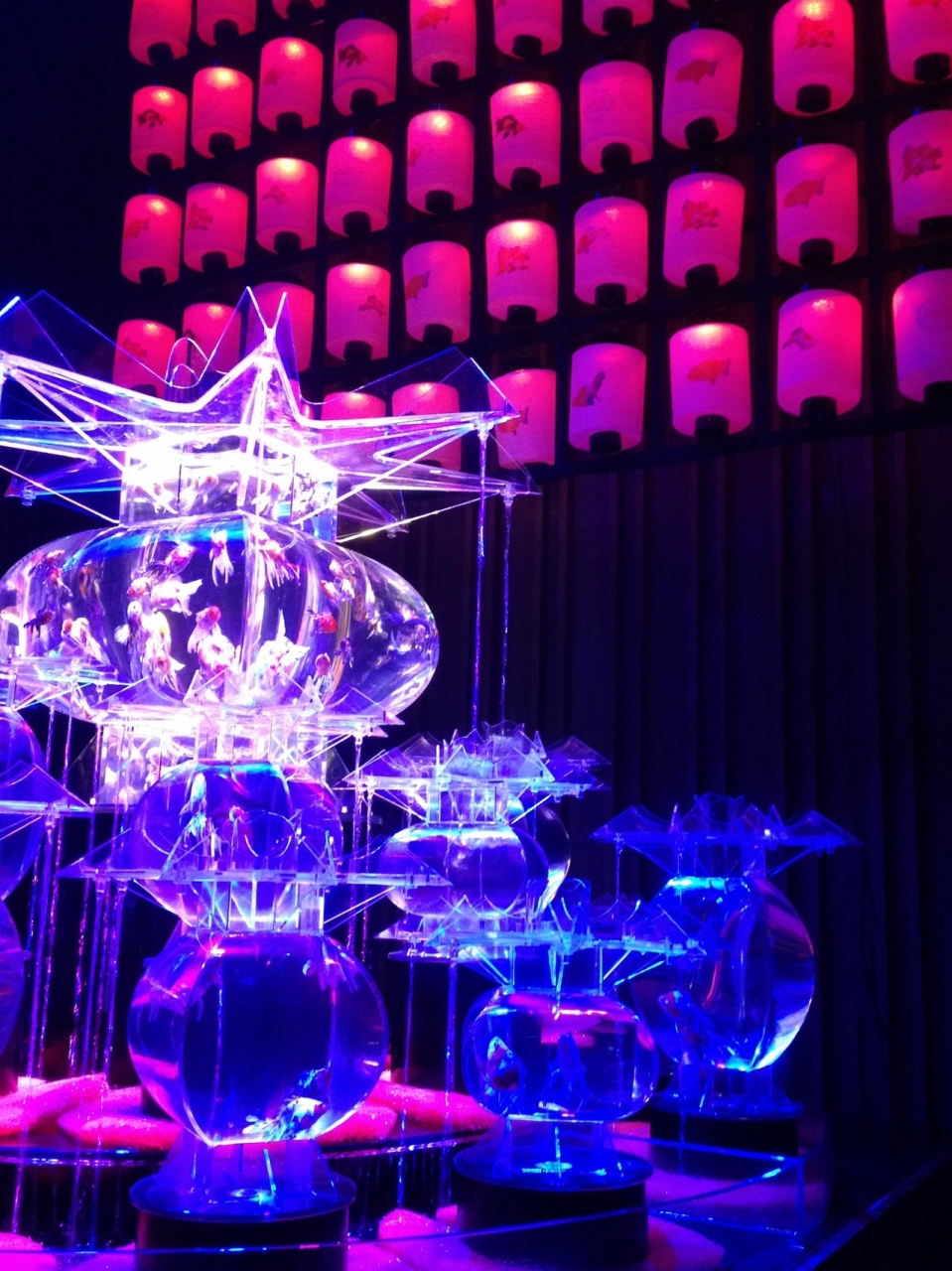 個性的な鉢やLEDなどを多用し金魚がアートに変身したかのように見える。