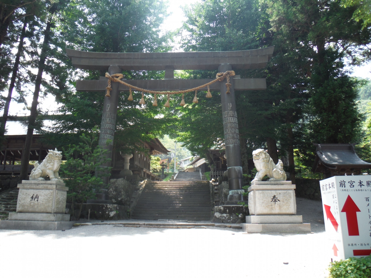御祭神である建御名方神が最初に居を構えたところと伝えられ、諏訪信仰の発祥の地とも言われています。道路からすぐの所に鳥居があり、その道路を挟んだ反対側に駐車場もあるので、そちらに駐車したくなりますが、上に上がった方が本殿まで行くにはおすすめです。ここから100mという看板がありますが、実際には階段と上り坂を200m以上は上がらねばなりませんから。