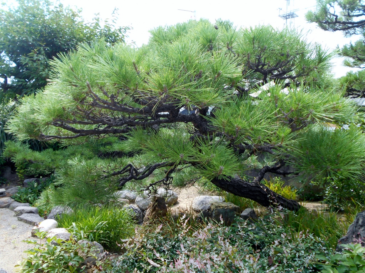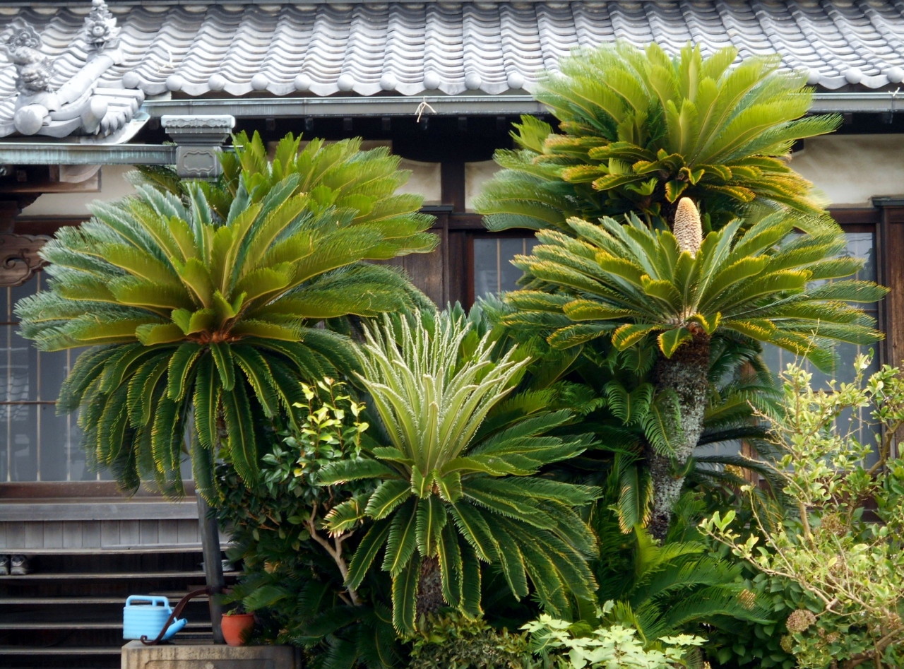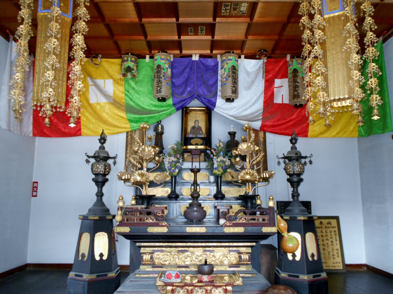 本瓦葺の立派な山門をぬけると、正面に二重屋根の本堂・本堂左手に地蔵堂・境内左手に弘法堂があります。弘法堂手前の樹齢200年のウバメガシ、本堂右手前の蘇鉄山、弘法堂付近の松も見どころです。