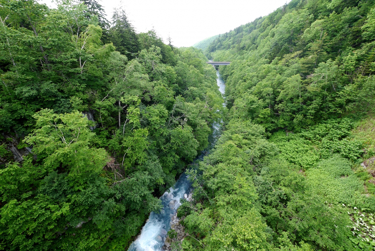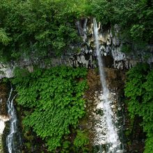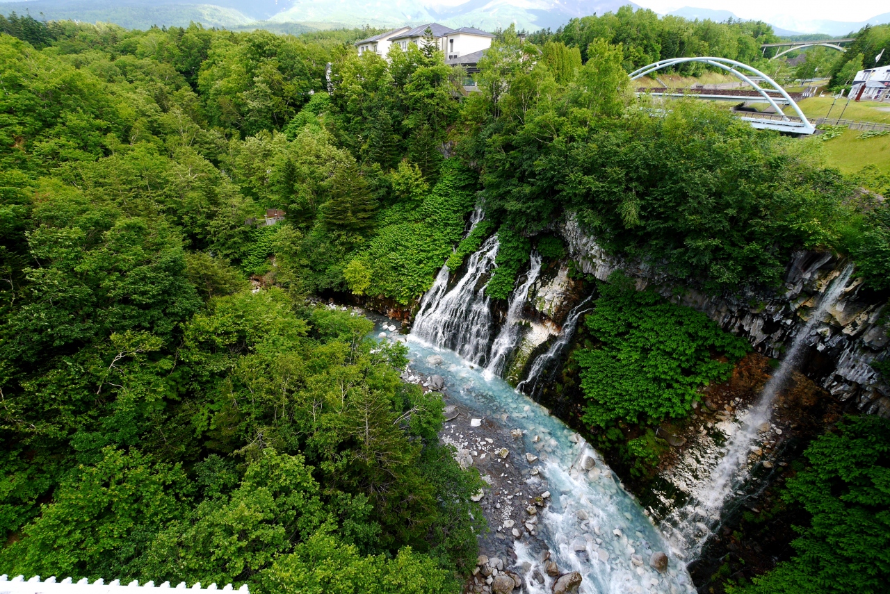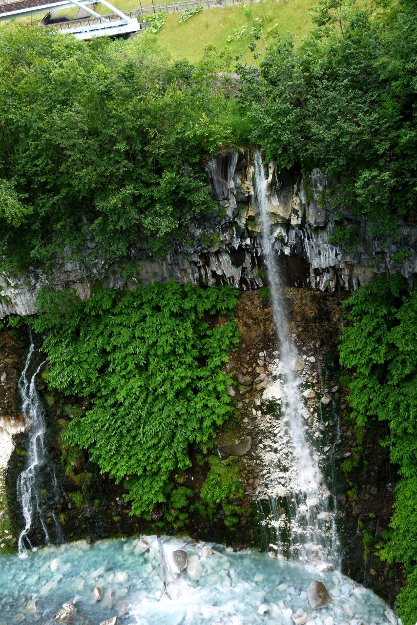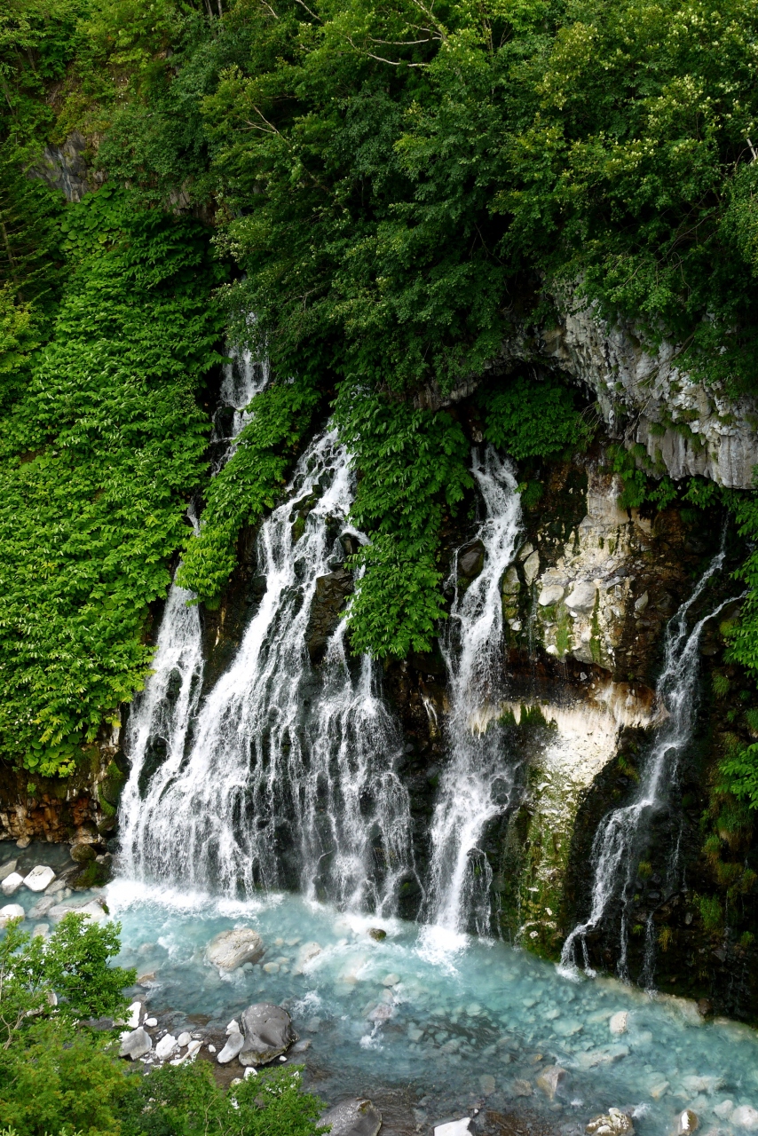 十勝岳側から白金温泉のT字路を左折してすぐのところにあるが,標識がないため見逃してしまった.当然美瑛側からは大きな看板があるのでわかりやすいが要注意.駐車場はなく路上に車を何台か停められる.コバルトブルーの川の上に白いひげのような滝.一見の価値あり