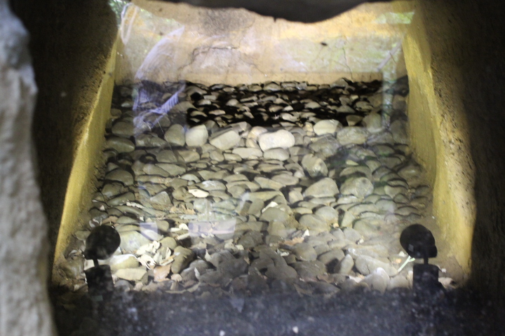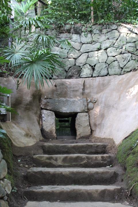 等々力渓谷の左岸崖面に横穴墓が6基以上発見され、中でも3号横穴は埋葬人骨や副埋葬品も良好であったことから保存措置が講じられた。3号横穴墓は奥行13mで玄室と羨道からなる墓室とこれに至る墓道に分かれている。横穴墓に近付くと自動で照明がつきます。