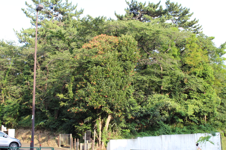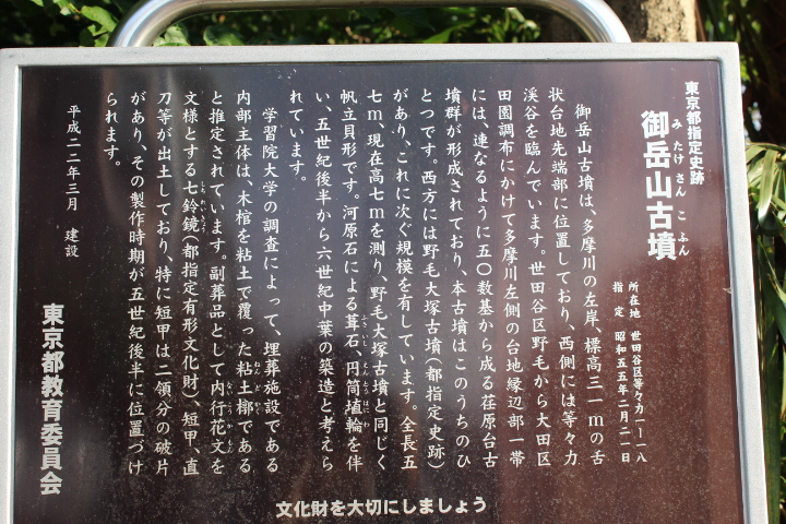 等々力不動尊の門の対面の茂みが御嶽山古墳です。古墳の案内板がなければ通り過ぎてしまいそうな古墳です。外からはどこが古墳か識別が出来ませんが、一帯が茂みになっているのでその中にあるようです。この辺りは野毛大塚古墳、等々力3号横穴など遺跡が集中しています。