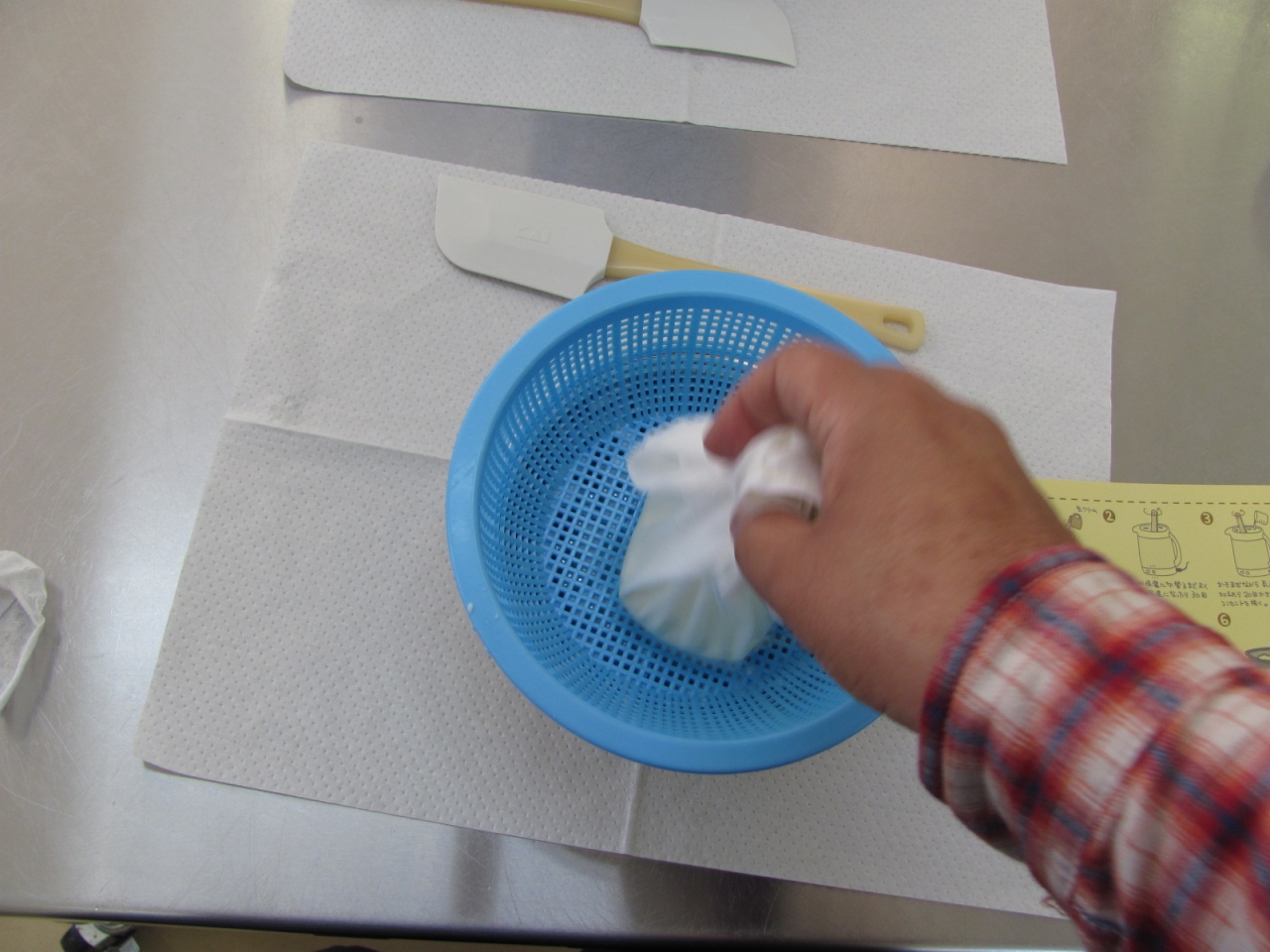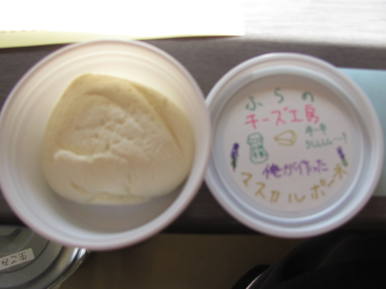 富良野チーズ工房でチーズ作りをしてきました。富良野牛乳をポットで温めかき混ぜます。するとだんだん固まりと液体に分離するので、それをふきんでこして水気をとっていきます。そうするとマスカルポーネの完成です。自作ラベルのケースに入れ持ち帰り、トーストにつけて食べました。