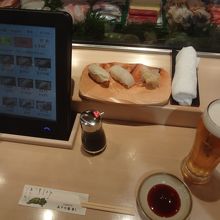 新千歳空港3階にある立ち食い寿司のお店です。立ち食いなのでさっさと食べることが出来、時間のないときには特に便利です。立ち食いではありますがネタは新鮮です。この日もあまり時間がなかったのでランチ時にさくっとつまんできました。カウンターの前に陣取ってタッチパネルで注文を開始します。注文を入れるとすぐに目の前の板前さんが握ってくれます。ネタは色々。でも立ち食いにしては値が張ります。それだけネタが良いのでしょう。提供されるのは1貫ずつ。表示価格は1貫の値段です。ついつい生ビールも注文してしまいました。