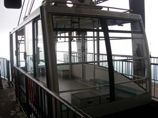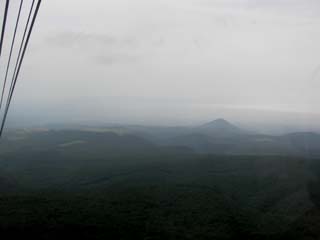 ロープウェイの後ろに乗って出発するとすぐに展望が開けて、高曇りで周囲の山が見えていて、遠くに薄っすら青森湾が見えています。中間点で上から降りてくるロープウェイと交換して、10分ほどで標高差650mの山頂公園駅に到着しました。