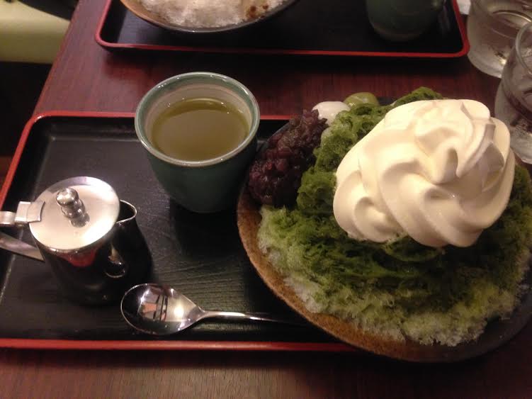 渋い抹茶がかかったカキ氷に、ソフトクリーム、あんこ、白玉が乗っており、好みで甘い蜜をかけていただきます。