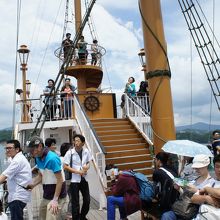 パールクィーンは、九十九島を巡る遊覧船。約一時間の行程です。点々と浮かぶ島の間を抜けていくんですが、真珠や牡蠣の養殖いかだもあるし、きれいなだけじゃなくて豊かな海であることも感じます。ハイライトは、入江の奥のUターン。ここは、ちょっと水深が深いよう。緑色に輝く入江に白い軌跡を描いて、見事に回り切りました。