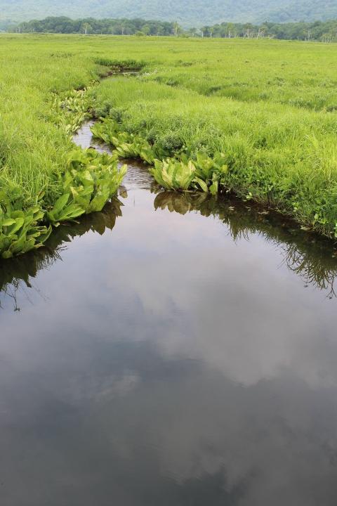 尾瀬ケ原1周ハイキングの際立ち寄りました。竜宮十字路の西側に竜宮カルストと呼ばれる池塘があります。南側の池塘には絶えず大量の水が流れ込んでいるのに流れ出る所が見えない。一方、北側の湿原にはどこからも水が流れ込まず流れ出ているだけなのに、いつも満々と水をたたえている池塘があります。この2つの池塘は侵食されて出来たトンネルによって繋がっており、水はそこを流れているようだ。湿原の下を流れる水は海底の竜宮城にも繋がっていると考えられ竜宮と言われるようになったそうだ。