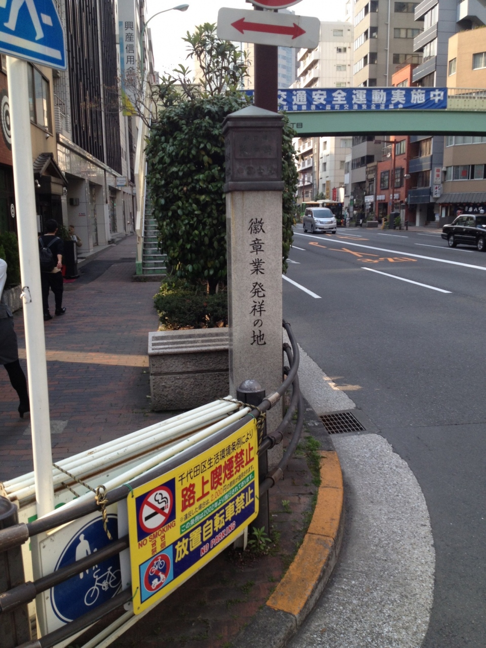 徽章業は飯田町の日本徽章商会から生まれたらしく、現在もこのあたりは徽章業に従事する人が沢山いるらしいですが、興味がない人には…な碑です。