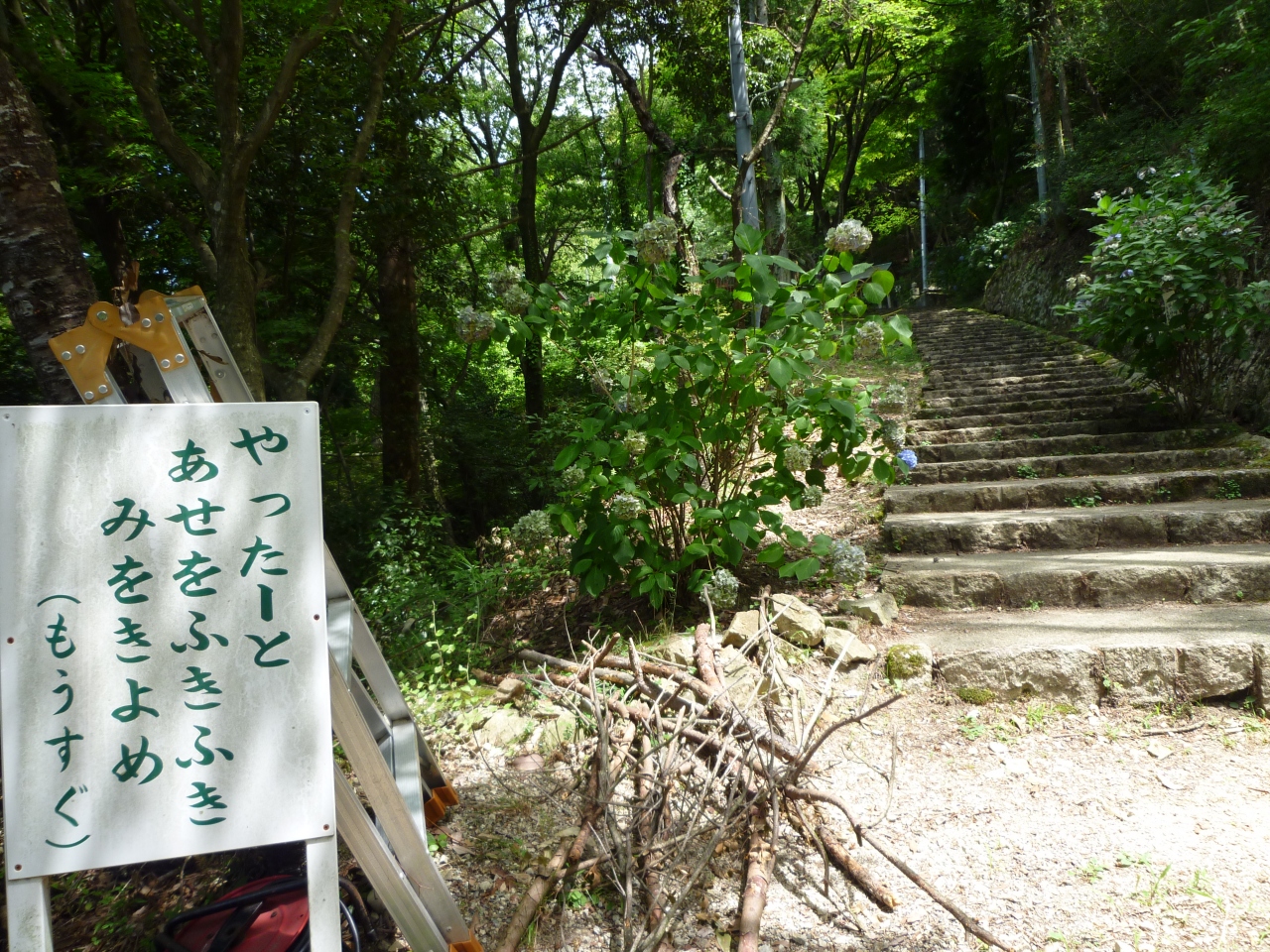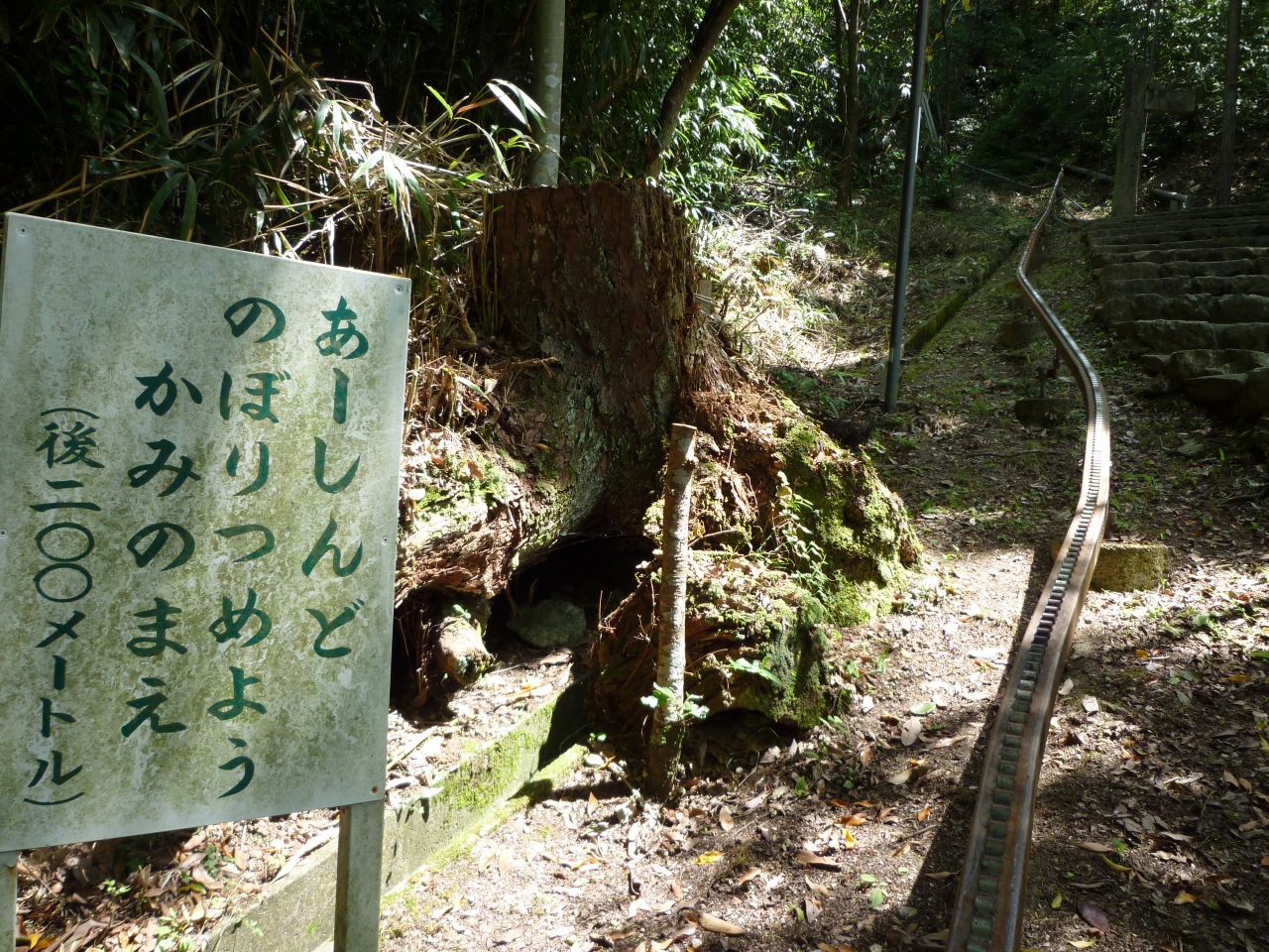 最初の石段は70段くらいかな。そこに第一の看板が(写真参照してください)。それでがんばろうという気持ちになって、進めます。