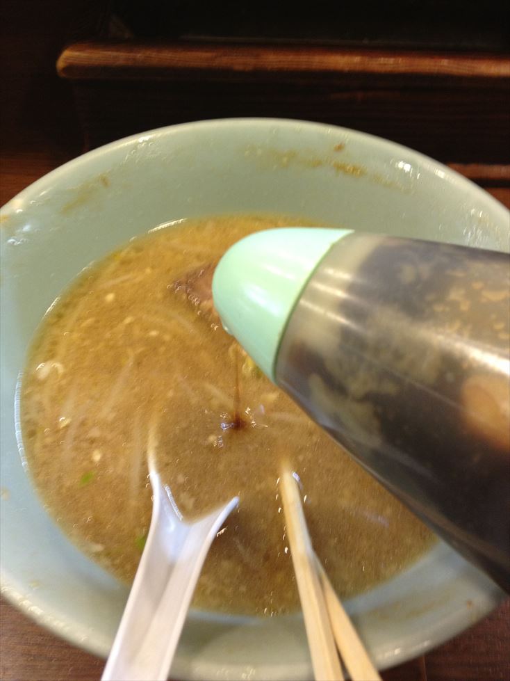 ラーメン二郎では、その日の体調で、味が薄いと思った時は、たくさん食べて、味に飽きが来た時には、最後にこのソースを掛ける事をお勧めします。これにより、味が変わりますので、ぜひ、一度、らーめんを食べてみてください
