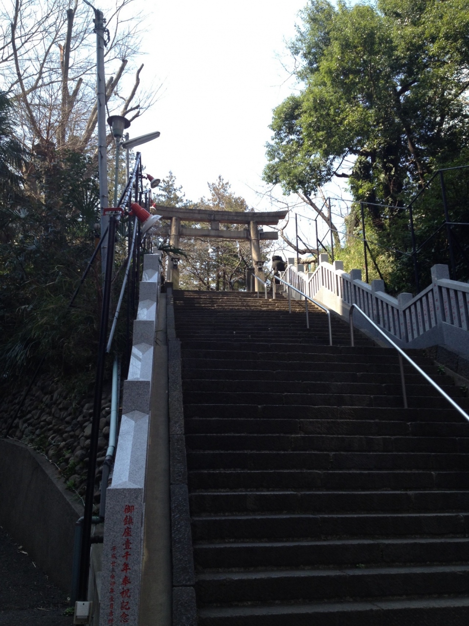 男坂の坂上というか階段をのぼりきったところからのものです。傾斜が険しいのが男性で、緩やかのが女性と言うことでしょう…